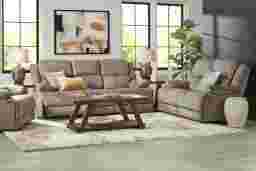 Cozy style and intimate appeal give the Townsend living room a warm, relaxed charm. Transitional in style and upholstered in a soft woven fabric, this set features comfortable padded arms and attached seat and back cushions for a luxurious feel. A chaise pad footrest on the reclining sofa provides a wider space to stretch and relax while the non-power recline function adjusts to your personal preference. The sofa also features a fold-down table with storage and cupholders for convenience and ease, making this collection perfect for entertaining guests or unwinding at the end of the day. Upholstery: 100% Polyester. Cleaning Instructions: Use water based cleaning agents or foam. Accent pillows not included.