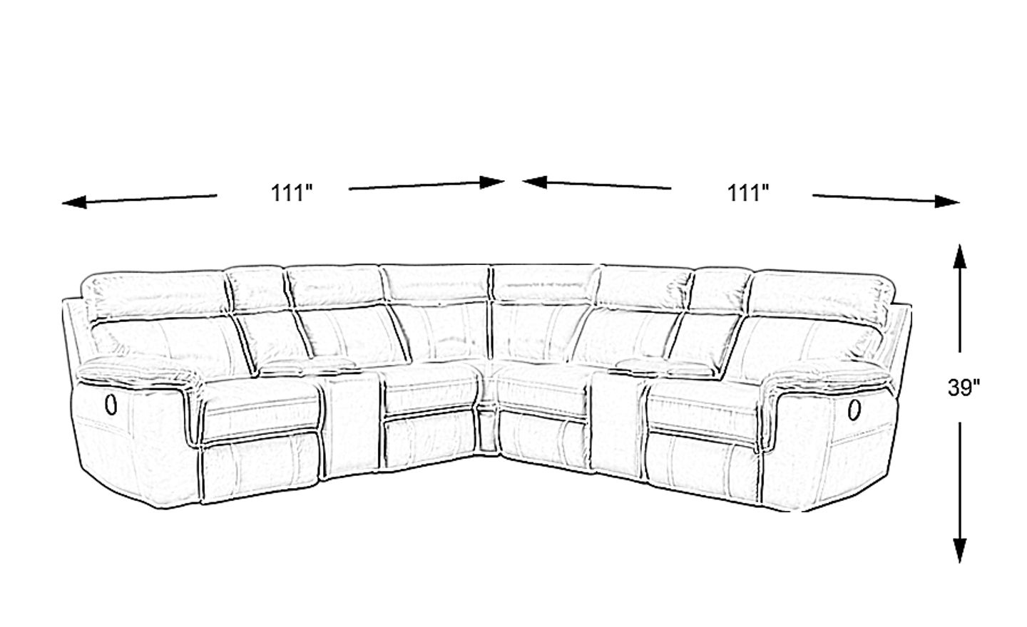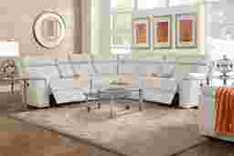 Luxe comfort meets modern design in the chic Trafalgar Square reclining sectional. Upholstered in top grain leather where the body touches and rendered in a sophisticated shade of ivory, this sumptuous sectional shows off its premium quality with baseball stitching detail. Pad over arms, wing back cushions and chaise footrests offer head-to-toe pillow soft support for up to five people, while a lift top storage compartment and dual cup holders on each console cater to your every need, allowing you to lounge in comfort. The recliners on each end of the sectional feature smooth power reclining mechanisms that raise and lower the footrests with the touch of a button. Designed to work well in smaller spaces, this cozy sectional offers big comfort in a compact package. Upholstery: Top grain leather where the body touches and vinyl sides and backs. Leather is a durable, low maintenance product, however, general regular maintenance is necessary. To keep your leather clean, vacuum it regularly, removing any dust, and clean it with water and a mild non-detergent soap.