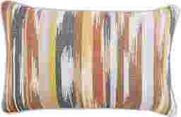 Rustic adventure and lively design live and breathe in the Transformation Canyon pillow, where charming textures and vibrant colors uplift the room in spirited style. Abstract stripes of blue, yellow, and orange taper to irregular edges on a background of beige for easygoing appeal. 100% Sunbrella fabric.