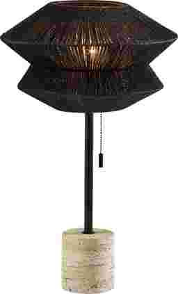 Introducing the Traverse Drive Black Lamp, where contemporary design meets natural elements for a striking lighting piece. With its sleek black finish, the lamp offers a modern aesthetic that effortlessly blends with any decor style. The origami-shaped black rope shade adds an intriguing geometric dimension, while the chunky travertine stone base provides stability and a touch of rustic charm. At 14 in height, this lamp is the perfect addition to desks, bedside tables, or accent tables, offering both functionality and style. Partial assembly may be required.