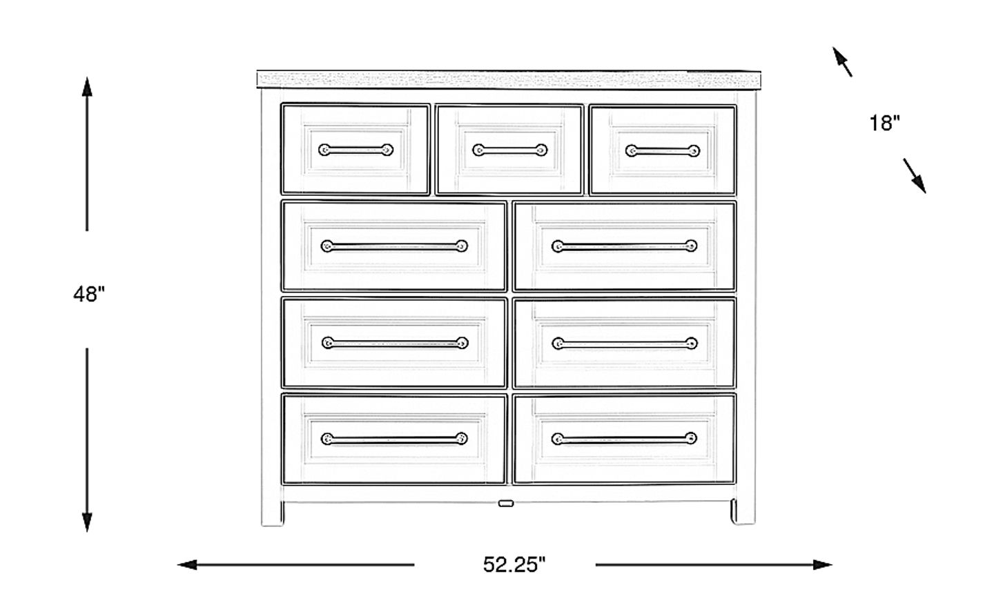 Clean lines and a cottage-inspired design in the Tremblay Square bureau brings classic sophistication to a refreshingly serene aesthetic. Contemporary in style, this piece features a dark brown top and pulls that create an elegant contrast and unique framed look. The nine drawers are constructed with English dovetail joints and side mounted full extension ball-bearing glides for support and longevity. Felt-lined top drawers and dustproof bottom drawers ensure the quality of your belongings while complimenting the elegant look.