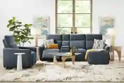 When the home feels most alive in its most relaxed moments, a refined comfort settles in with the Tremont collection, inviting all to lounge in style without sacrificing function. Contemporary in design, this sectional living room is upholstered in indigo blue woven chenille and finished with welted seams for a clean, tailored look. Soft radius arms and supportive back cushioning invite you to sink in, while power reclining lets you adjust the footrest with ease using activator switches that include both USB-A and USB-C charging ports. The included console brings extra convenience with a tray surface, hidden cupholders, and storage. To complete the ensemble, coordinating jacquard accent pillows add texture, depth and color. Upholstery: 100% polyester. Tables and lamps not as shown in room image. Small accent pillow not included.