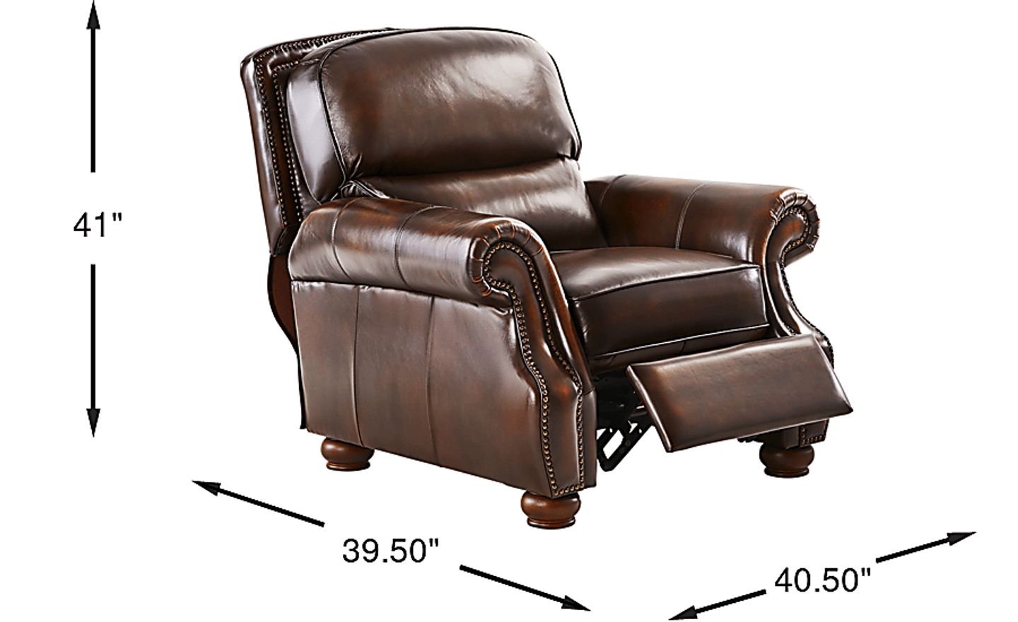Timeless tradition and rich warmth welcome every sit with the Trevaro collection from Cindy Crawford Home as it brings refined ease and classic craftsmanship to the heart of the home. Upholstered in brown top grain leather where the body touches, this traditional recliner features a plush seat and back cushion for sink-in comfort. Rolled arms and a classic nailhead trim boast tailored character, while subtle stitching and paneled shaping add depth. The push back mechanism offers easy reclining for further relaxation. Turned bun feet ground the piece with an heirloom-inspired finish, and coordinating accent pillows introduce a soft touch with intricate patterns. Upholstery: Top grain leather where the body touches with polyurethane sides and back.