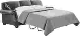 Timeless tradition and rich warmth welcome every sit with the Trevaro collection from Cindy Crawford Home as it brings refined ease and classic craftsmanship to the heart of the home. Upholstered in dark gray top grain leather where the body touches, this traditional sofa features plush seat and back cushions for sink-in comfort. Rolled arms and a classic nailhead trim boast tailored character, while subtle stitching and paneled shaping add depth. Tucked away is a Nature's Bed gel foam sleeper mattress that easily transforms your living room into a cool and comfortable sleep space for overnight guests. Turned bun feet ground the piece with an heirloom-inspired finish, and coordinating accent pillows introduce a soft touch with intricate patterns. Upholstery: Top grain leather where the body touches with polyurethane sides and back.