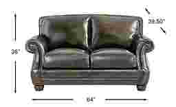Timeless tradition and rich warmth welcome every sit with the Trevaro collection from Cindy Crawford Home as it brings refined ease and classic craftsmanship to the heart of the home. Upholstered in dark gray top grain leather where the body touches, this traditional loveseat features plush seat and back cushions for sink-in comfort. Rolled arms and a classic nailhead trim boast tailored character, while subtle stitching and paneled shaping add depth. Turned bun feet ground the piece with an heirloom-inspired finish, and coordinating accent pillows introduce a soft touch with intricate patterns. Upholstery: Top grain leather where the body touches with polyurethane sides and back.