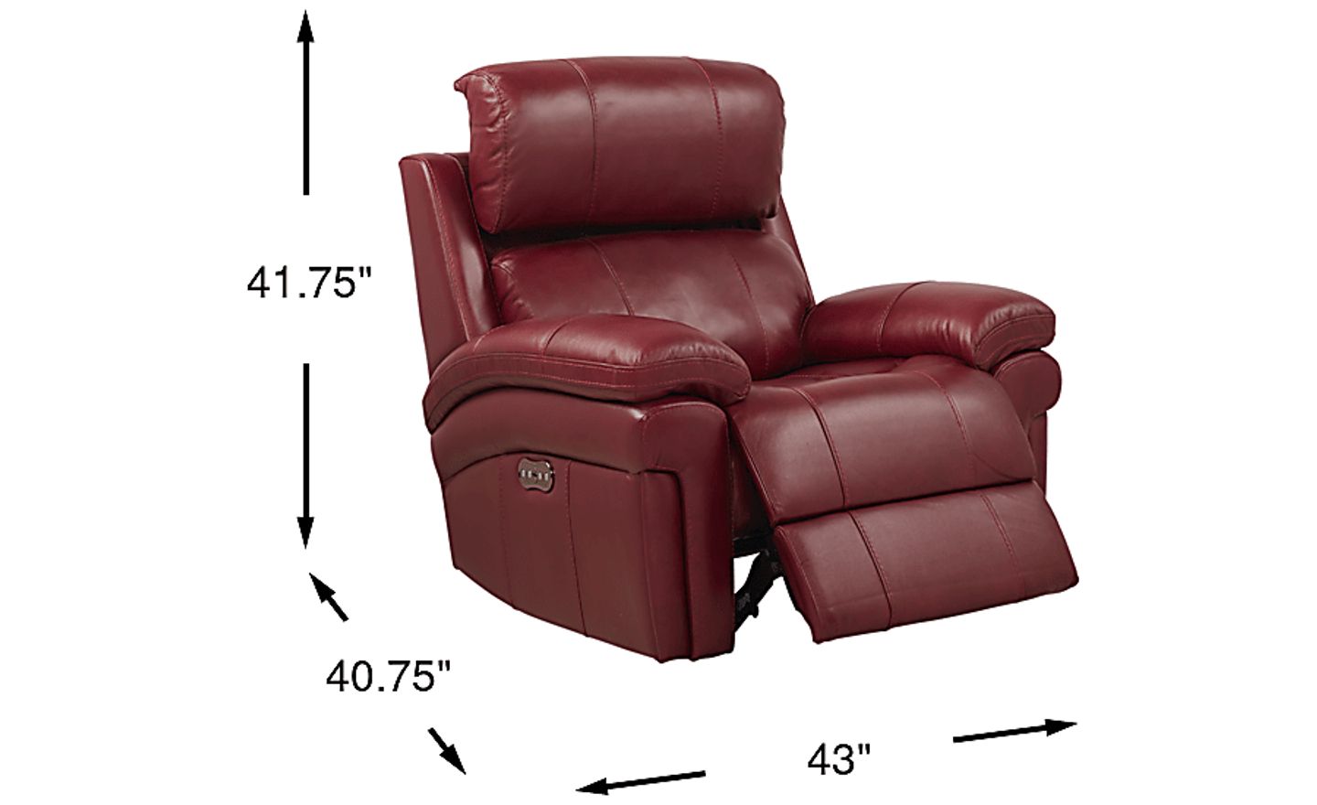 Loaded with features, the Trevino dual power recliner offers the perfect place for watching movies and sports. Supple top grain leather where the body touches, an envelope style back, contoured seat and pillowtop arms cradle you in comfort while the power headrest and footrest raise and lower for customizable comfort with the touch of a button. Premium perks include a memory switch for easily returning to favorite positions. The power headrest feature provides three extra inches of back height that tilts forward to create the most comfortable position for watching television. A USB port allows for easy charging of any mobile device. Contrasting baseball style stitching detail adds just the right complement to the leather's rich burgundy color. Top grain leather where the body touches and vinyl sides and backs.