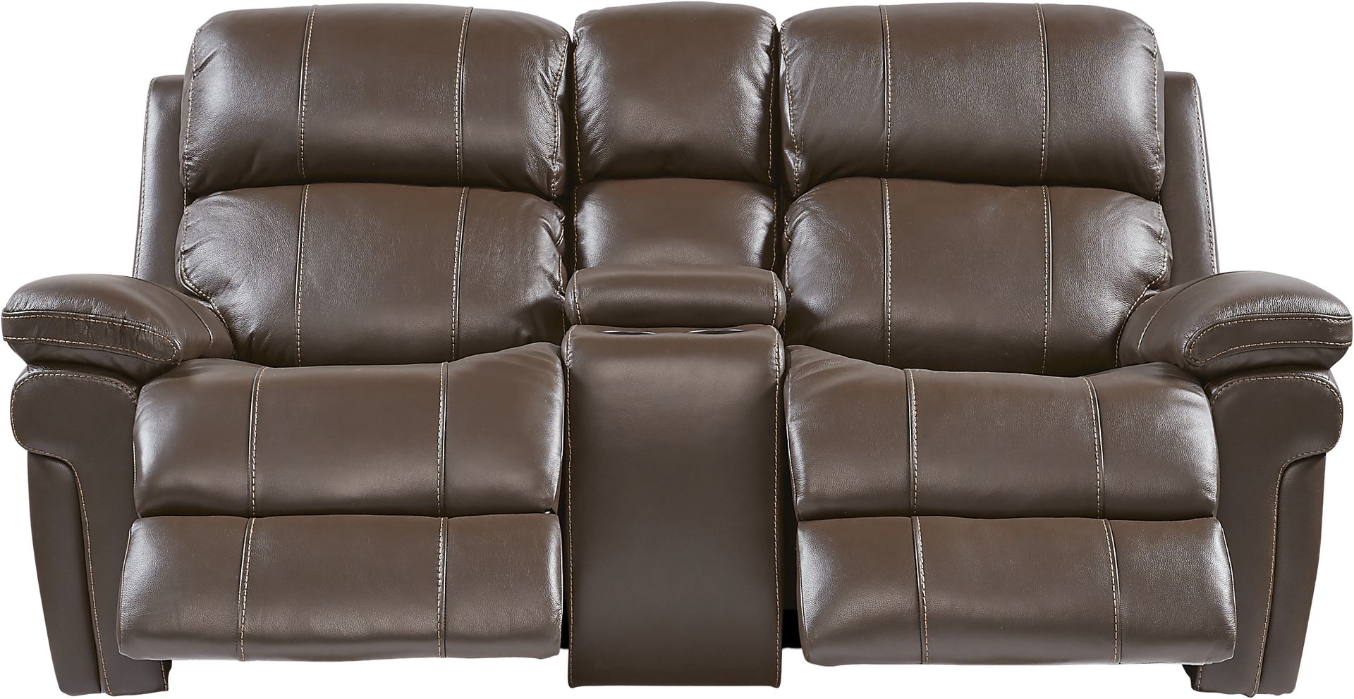 Seating for two is luxuriously comfortable and convenient with the Trevino Place dual power reclining loveseat. Upholstered in top grain leather where the body touches, the loveseat has twin cupholders, a lift-top storage console and USB ports on each side. Additional premium features include power headrests and padded power footrests that raise and lower for customized comfort at the touch of a button. An innovative memory switch gives instant access to repeat favorite positions. The power headrest feature provides three extra inches of back height that tilts forward for the most comfortable position for watching television. Contoured bucket seats and pillow top arms add cozy elements while contrasting baseball style stitching detail adds just the right complement to the leather's rich chocolate color. 24" extension when footrest is fully reclined. Allow 8" for wall spacing. Top grain leather where the body touches and vinyl sides and backs.