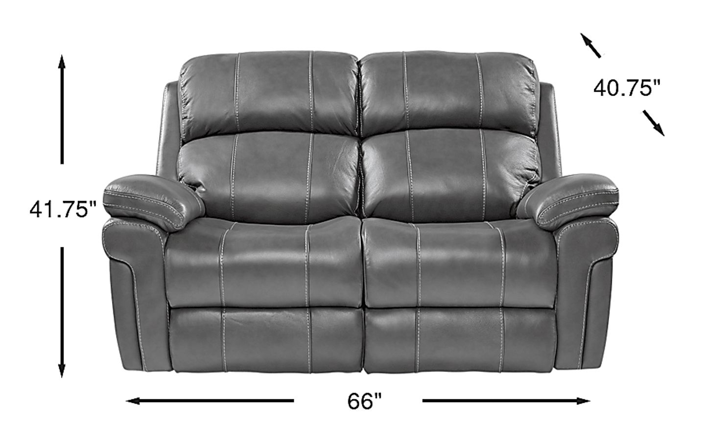 Seating for two is luxuriously comfortable with the Trevino Place loveseat. Made for relaxing movie nights and watching the big game, the loveseat is upholstered in smoke gray colored supple top grain leather where the body touches. Contoured bucket seats and pillow top arms add cozy elements while contrasting baseball style stitching detail adds just the right finishing touch. Top grain leather where the body touches and vinyl sides and backs.