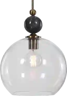 Topped with a rich black marble ball, the one light Trevor Lane pendant features an oxidized aged brass finish enhancing the simple but elegant line of the clear 13 inch diameter glass globe. When simplicity is your best decision for tasteful decorating. Professional installation recommended by an electrician.
