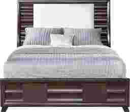The Tribeca queen bed is a statement in uncomplicated design. Crafted of wood solids and ash veneers, the round and flat panels combined with the upholstered headboard create a compelling impression. A deep wenge finish with copper undertones completes the look, while quarter cut veneers enhance the wood grain.
