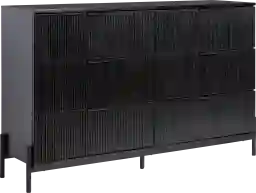This piece captures the essence of mid-century aesthetics through its sleek, tapered legs and distinctive reeded drawer fronts. These architectural details, paired with a solid black finish and low-profile tab pulls, create a sophisticated texture that complements both retro-inspired and contemporary modern interiors.