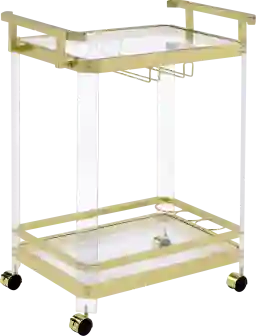 The Trinitycoast server cartlets you mix and serve drinks to your guests right at the table-side. This cart comes mounted on durable casters for easy mobility with a frame that is crafted from thick, clear acrylic that's both lightweight and sturdy. The top and lower shelf are each made from clear tempered glass. The bottom shelf comes with a metal gold chrome-finished bottle holder for three wine or liquor bottles and a hanging stemware storage rack offers a functional and beautiful display option. Customer assembly is required.