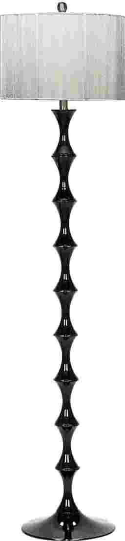 Give any room a little glamour with the dramatic design of the Trishelle floor lamp. Featuring a tall glossy black metal base featuring modern curved lines, this lamp is topped with a shimmering drum shade and brushed nickel finial.