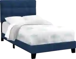 Create a striking look in the bedroom with this Troland twin size platform bed frame. Covered in a chic navy blue velvet, soft touch fabric over thick foam cushioning along the tufted backrest and sides for a cozy feel. The upholstered solid engineered wood frame is fitted with wooden slats along the base for solid support, and black block style plastic legs for increased load-bearing weight and stability. This comfortable, upholstered bed is perfect in small homes, apartments or condos. Spruce up your any bedroom in fashionable style with this transitional bed frame. This bed includes the headboard and frame only. A box spring and mattress is required but not included, low profile recommended. Customer assembly is required.