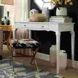 Energize your office space with the Tullia white desk. With elegantly tappered legs and brass finished hardware, this desk illuminates the smallest of rooms while using minimal space. Store your office items in the spacious front drawer. Featuring solid woods for durability, the Tullia desk will be a vibrant addition to your workspace or home. Customer assembly is required.