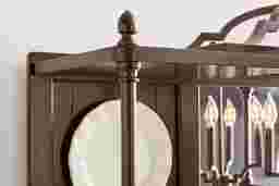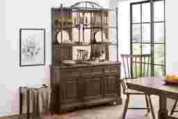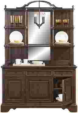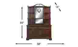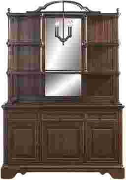 Rooted in the warmth of tradition, the Tullius collection brings heritage and hospitality to life through timeless craftsmanship and charming details. Finished in a rich dark brown hue, this traditional curio features framed molding, antique-style hardware, and a subtly tiered top. At its center, a mini chandelier casts a warm glow across the paneled slats and mirrored back, illuminating shelves designed to display fine china, glassware, or cherished keepsakes. Below, three drawers and three cabinet doors provide generous storage for dining essentials, while finial-topped posts and an arched crown complete the piece with an elegant, heirloom touch.