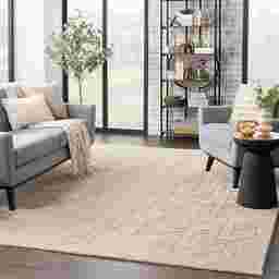 The heathered ground features nuanced color variations created by blending different shades of beige wool before weaving. This artistic technique adds a sophisticated depth to the contemporary style and serves a practical purpose: the multi-tonal fibers are much more forgiving than solid colors, as they naturally help to camouflage small bits of lint, dust, or pet hair between cleanings.