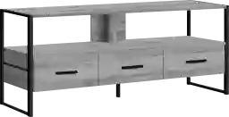 Bring industrial-inspired style to your entertainment space with this low-profile open back Twilley tv stand. The bold design starts with strong black satin metal supports at each end and in the center, and with a sturdy 48-inch-long shelving that can hold any size TV once centered. Finished in a grey wood-look laminate, this entertainment console features a long open shelf for media storage equipment or a sound bar. The three closed drawers on smooth metal glides, are accented with sleek black handles, roomy enough to store all your accessories, keeping everything organized in one place but out of sight. Customer assembly is required.