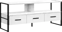 Bring industrial-inspired style to your entertainment space with this low-profile open back Twilley tv stand. The bold design starts with strong black satin metal supports at each end and in the center, and with a sturdy 48-inch-long shelving that can hold any size TV once centered. Finished in a modern white laminate, this entertainment console features a long open shelf for media storage equipment or a sound bar. The three closed drawers on smooth metal glides, are accented with sleek black handles, roomy enough to store all your accessories, keeping everything organized in one place but out of sight. Customer assembly is required.