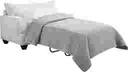 The crisp, graceful spirit of tranquil lakeshore living comes home in the Twin Falls collection, where casual lounging and effortless entertaining becomes second nature. Upholstered in a soft woven fabric with a serene ivory hue, this contemporary sleeper chair features welted seams that trace its sleek track arms and clean-lined silhouette. The pillow-style back and deep cushion provide plush comfort while maintaining a tailored, modern look. Tucked away is a twin Nature's Bed gel foam sleeper mattress that easily transforms into a cool and comfortable sleep space for overnight guests. Complementing geometric accent pillows add a playful touch of color and depth, while tapered black legs ground the design with quiet sophistication. Upholstery: 100% Polyester.