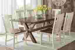 A cozy, rustic-meets-traditional style gives the Twin Lakes table an updated take on the classic farmhouse table. This sturdy piece is an ideal place for mealtime gatherings, whether you're sitting down for a casual brunch, or entertaining friends on its generous 84" surface. In fact, this amply sized table can accommodate up to 8 side chairs. The warm brown finish highlights the natural wood grain and light weathering details, making this handsome table a timeless standout in your dining room. Crafted of solid birch, it features a crisscrossed trestle base for added interest.