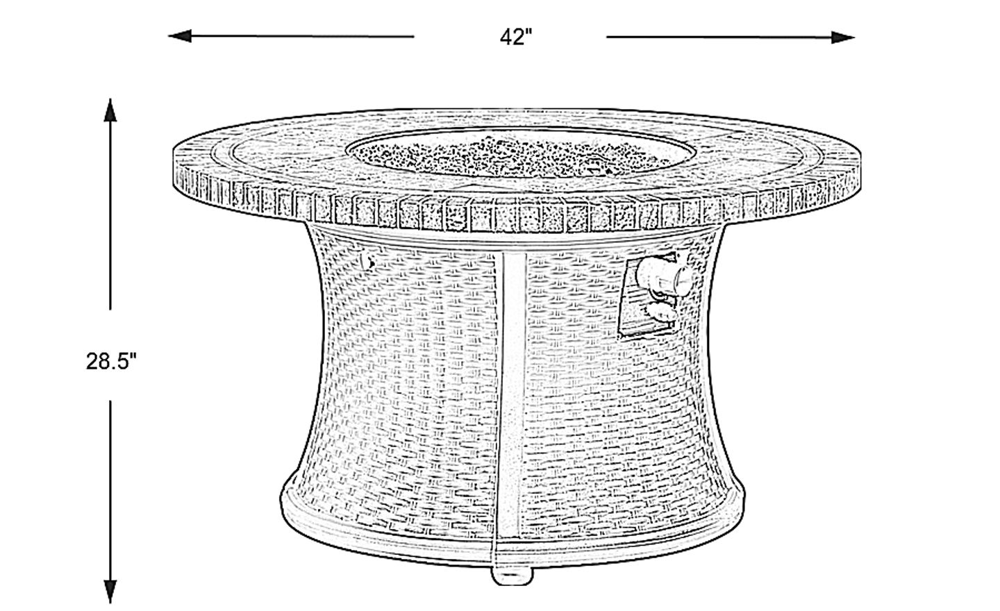 The Tybee Island fire pit features a stylish woven base and tile top. The pit is filled with half-inch reflective fire glass in a striking bronze color and comes with a lid. A hidden door opens to reveal storage for a standard propane tank with 50,000 BTU (not included) and the push-button igniter makes operation a breeze.