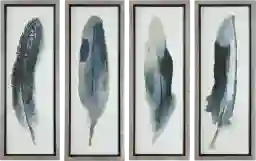 Dark blue and black hues against an off-white background create a striking contrast in the Tyberious set of 4 contemporary feather prints. These on-trend printed colors appear in a watercolor style. Each print is placed under protective glass and is accented by a champagne silver frame with a black satin inner lip.