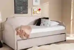 Featuring a roll-out trundle bed, the Tynland daybed can easily transform any space from living room to bedroom. The Tynland is foam-padded and upholstered in an elegant neutral fabric for easy coordination with a wide range of color palettes. The daybed is fitted with a pull-out twin size trundle, providing convenient accommodation for guests. Designed with both function and style in mind, the daybed features an elegant cut-out frame accented with chrome nailheads for a touch of glamour. This dynamic piece for furniture will allow you to maximize your space without sacrificing style. Customer assembly is required.