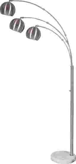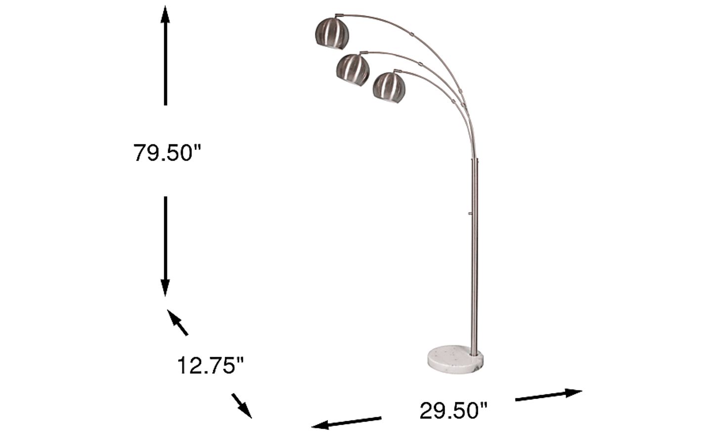 With three slim arched arms each having a large dome-shaped metal shade, the Astoria Arc Lamp is a great way to achieve overhead lighting with style. A 100 Watt bulb can illuminate a large sitting area while an brushed steel finish and substantial sophisticated white marble base complement the decor of any room. A rotary dimmer switch is located on the pole adjusting from bright light to mood lighting. This lamp has a clear cord and is smart outlet compatible. Bulb is not included. Assembly is required.