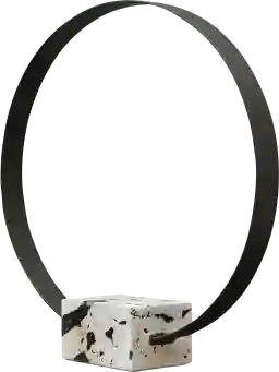 This Ucker circular metal sculpture is finished in a brushed satin black anchored by a natural white coral stone base with black accents. Customer assembly is required.