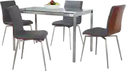 To maintain the sleek appearance of the stainless steel and the gray upholstered chairs, our care guides recommend regular dusting with a soft, dry cloth. For spills or stains on the metal legs, use a cloth dampened with warm water and a mild detergent. Avoid using harsh chemicals or abrasive cleaners, as these can dull the stainless steel finish. For the upholstered chairs, we recommend addressing spills immediately by blotting them with a clean, damp cloth.