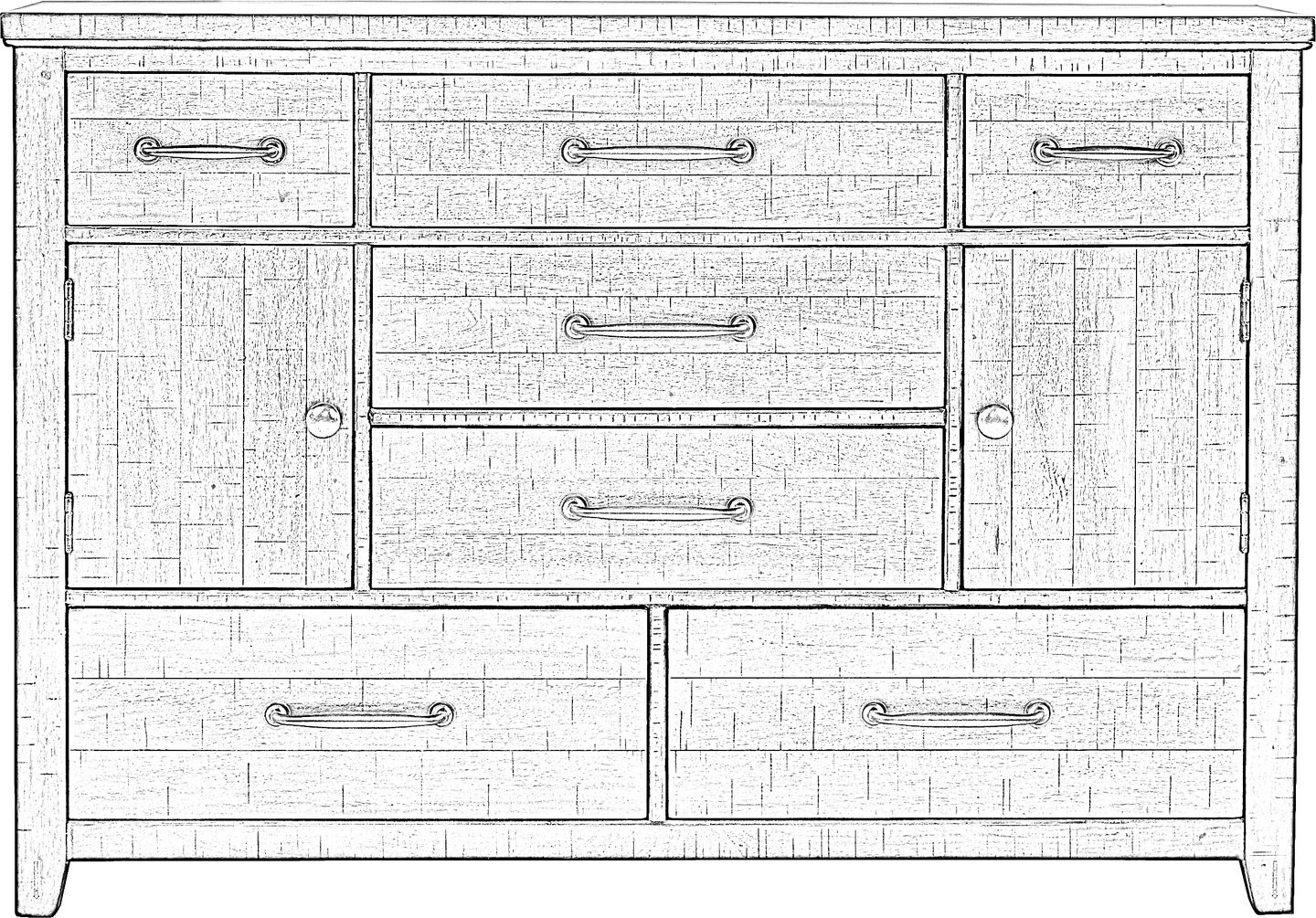 Stylish storage abounds in the Urban Plains door dresser. Crafted with mahogany and mahogany veneers, it combines the rustic charm of natural wood with distressed details for a casual look. English dovetail drawer construction adds stability, while felt-lining on the upper drawers makes them ideal for delicate items. Two doors each feature a removable shelf, adding additional storage to this already spacious dresser. The brown finish is accented with black metal hardware, adding an eye-appealing contrast.