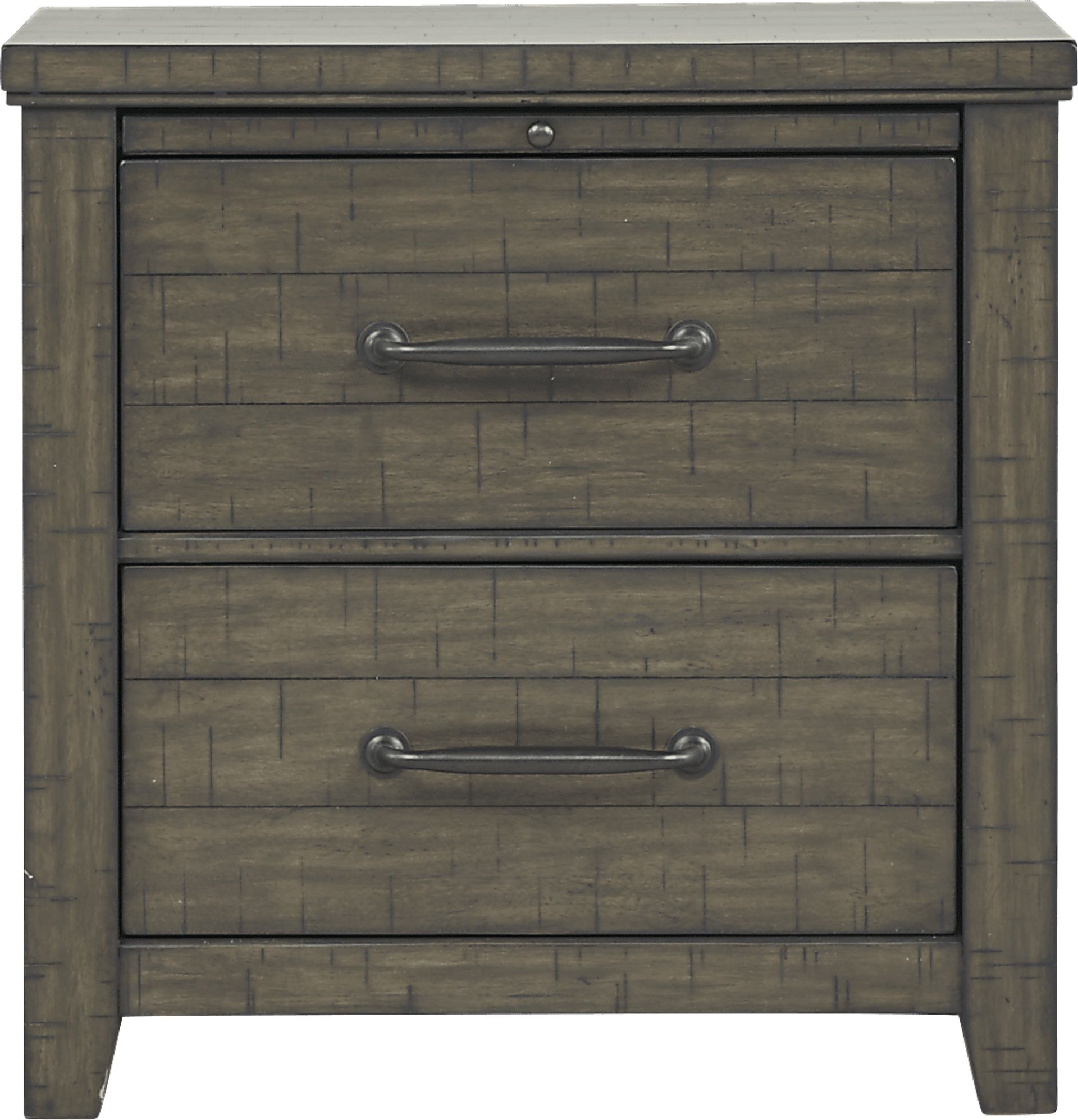 The Urban Plains nightstand is an excellent choice if you're looking to gain bedside storage. An upper tray pulls out, creating a great place to rest a book, tablet, or even a nighttime drink. Below that, two spacious drawers utilize English dovetail drawer construction for stability, while felt-lining along the upper drawer makes it an ideal place to store delicate pieces such as eyeglasses or jewelry. Crafted of mahogany with mahogany veneers, this versatile piece has a warm gray finish with distressed details that give it a cozy, well-loved look. Black finished hardware adds an edgy accent.