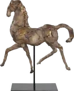 This piece is designed with a "Rustic" aesthetic, blending the organic form of an equestrian subject with a weathered metallic finish. While named the "Gold Sculpture," it primarily features an aged silver base that is enhanced by delicate gold detailing. This dual-toned look allows it to coordinate beautifully with both cool silver and warm gold hardware in traditional or farmhouse-style rooms.