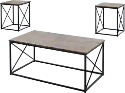 Add fresh vitality to your living space with this modern Valburn 3 piece coffee table set in a chic dark taupe wood look finish. The smooth and spacious laminate table tops are supported with simply designed sturdy black metal legs, accented with an X design on the sides for that extra appeal. The two matching square side tables can easily hold a lamp, pictures, or decorative accessories to complement the elegant rectangular coffee table. This contemporary table set will perfectly anchor your living room, family room, or den with style! Customer assembly is required.