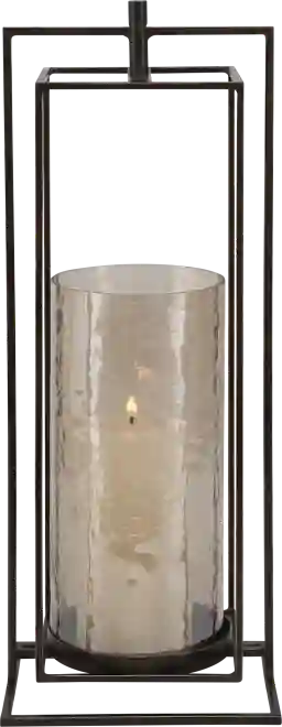 Illuminate your space with a warm glow from the Wenman textured glass and iron candle lantern. Designed to hold a pillar candle, it features a removable textured glass hurricane and iron stand finished in dark bronze with gold rub-through details. One white 3"x 5" candle is included.
