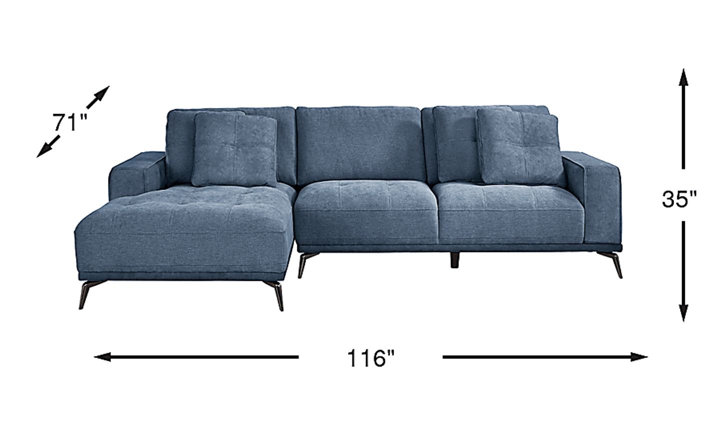A tufted elegance that gives comfort its own lavish style and panache, the Valencia sectional is perfect for those with discerning taste and a cosmopolitan touch. Contemporary in style, this luxurious set is upholstered in blue woven fabric with attached tufted seat cushions for a look of black-tie sophistication. Tufted, padded track arms add a sense of stoic handsomeness to the proceedings while canted, tapered metal legs deliver an eye-catching final touch. Upholstery: 100% Polyester.