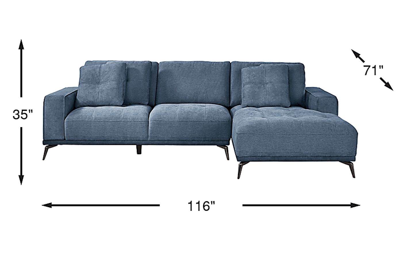 A tufted elegance that gives comfort its own lavish style and panache, the Valencia sectional is perfect for those with discerning taste and a cosmopolitan touch. Contemporary in style, this luxurious set is upholstered in blue woven fabric with attached tufted seat cushions for a look of black-tie sophistication. Tufted, padded track arms add a sense of stoic handsomeness to the proceedings while canted, tapered metal legs deliver an eye-catching final touch. Upholstery: 100% Polyester.