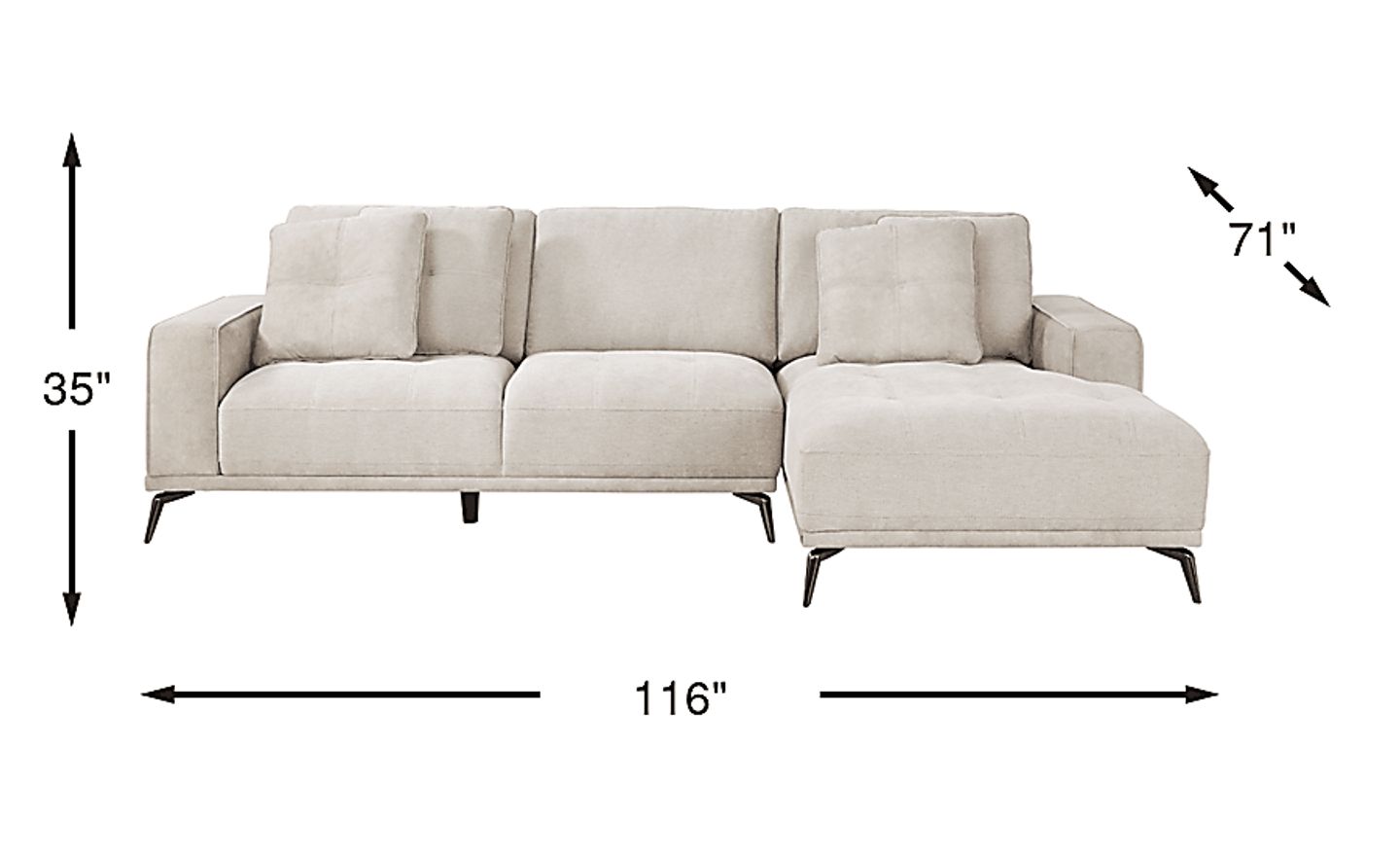 Tufted elegance that gives comfort its own lavish style and panache, the Valencia sectional is perfect for those with discerning taste and a cosmopolitan touch. Contemporary in style, this luxurious set is upholstered in light gray woven fabric with attached tufted seat cushions for a look of black tie sophistication. Tufted, padded track arms add a sense of stoic handsomeness to the proceedings while canted, tapered metal legs deliver an eye-catching final touch. Upholstery: 100% Polyester.