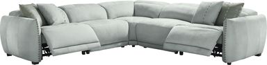 Understated drama with a touch of soothing elegance marks the Valerio collection, creating a stylish space made for serene lounging with its cloud-like silhouette and tailored details. Fully upholstered in hydra green nubuck, this sectional creates a cozy, modern look with its low-profile silhouette and pillowy curves. Rounded mailbox arms with leather contrast stitching showcase a decorative ribbon accent for a crafted touch of charm. Dual power reclining invites personalized relaxation with adjustable headrests and footrests while a control panel with USB ports is nestled discreetly between seat cushions. Matching toss pillows with a contrasting accent thread offer a final layer of texture and visual interest. Upholstery: 100% Nubuck. To clean, use a soft bristled brush and/or a vacuum cleaner to remove surface dust and debris. For stains, dip a clean cotton cloth in a small amount of water and gently press into the stained area. Do not rub the stain.