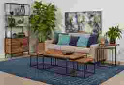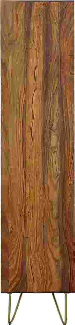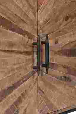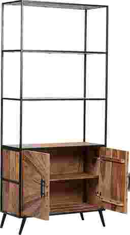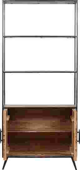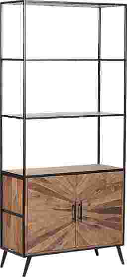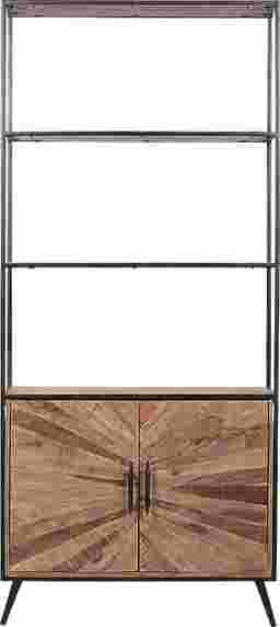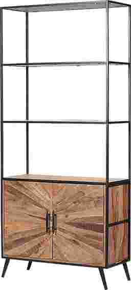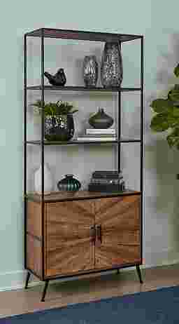 Rich rustic wood tones gleam on the sunburst pattern, lending this Valgro tall bookcase a wonderful industrial look. Open shelves provide ample space to display books andcollections, and with additional storage space behind two doors, the options for organization are abundant. A wonderful addition to any decor, but placing one of these bookcases on either side of the matching console will create an outstanding display in any living room. Customer assembly is required.