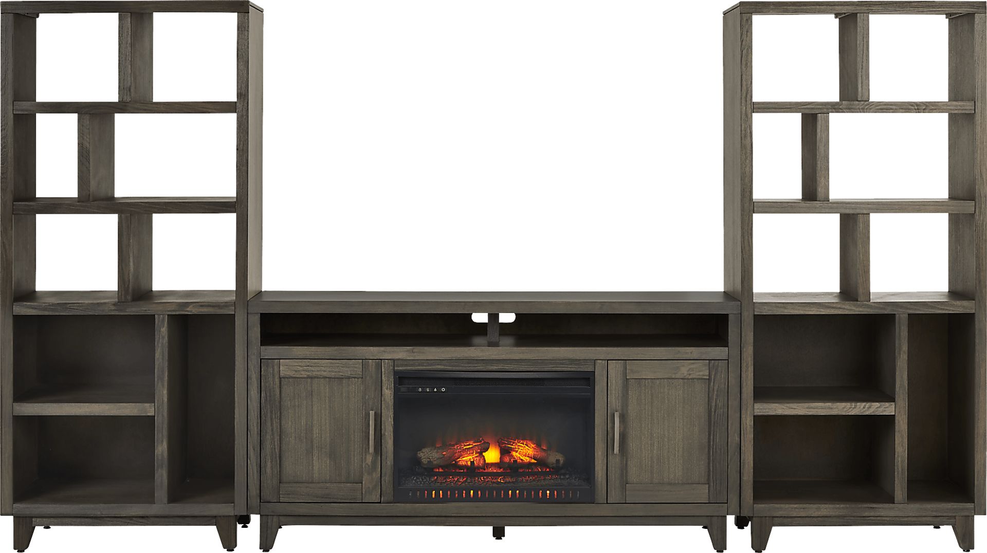 Featuring a rich blend of rustic touches and contemporary flair, the Valinor entertainment console offers a stunning storage solution. Crafted of poplar solids in a brown finish, this console is designed to store away media essentials with two cabinets equipped with adjustable shelves. Multimedia compartments have rear wire passing holes for better cable management. Two matching pier units offer nine shelves each for stylishly displaying all your favorite things. At the center of it all is the electric log firebox. Innovative flame effects create added depth and 3D realism while a convenient remote control adjusts the heat and glow levels and includes a built-in timer.
