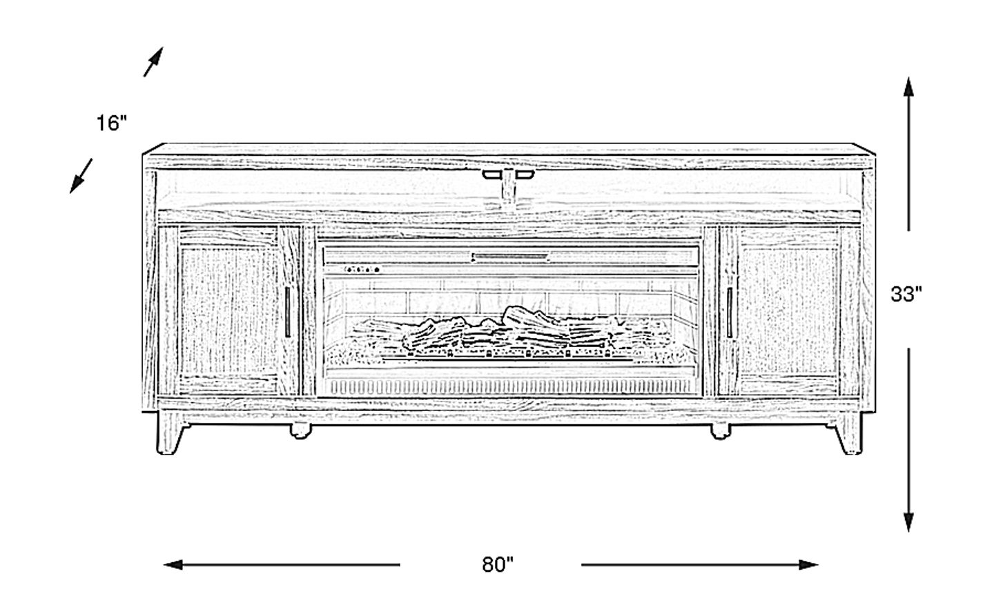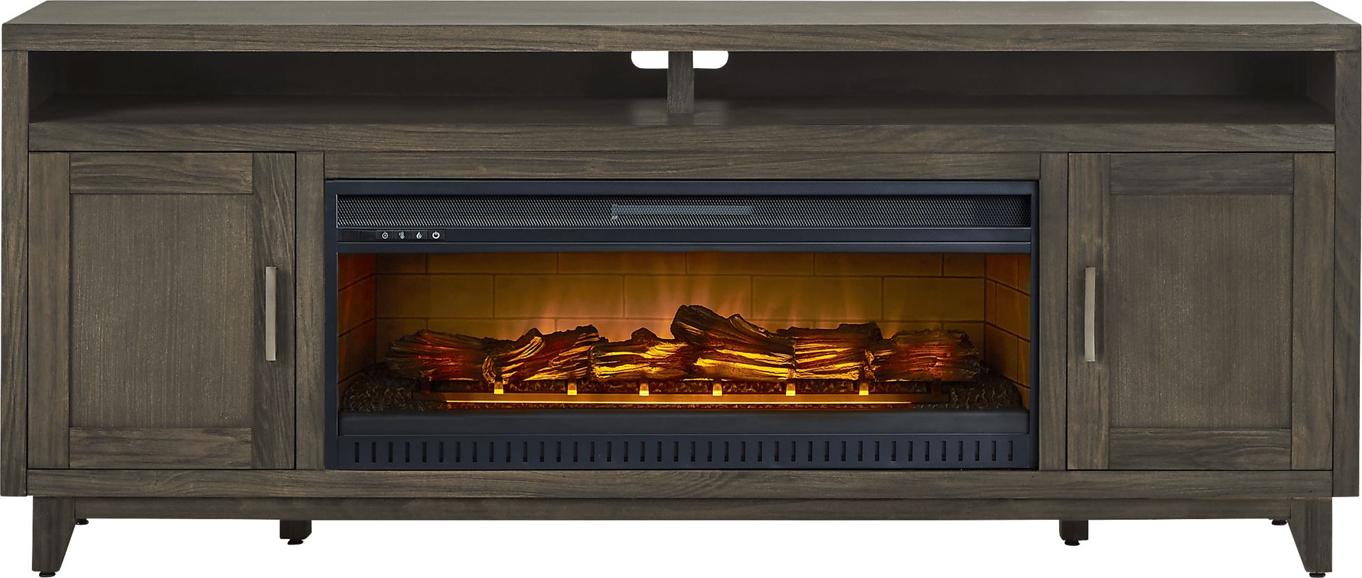 Featuring a rich blend of rustic touches and contemporary flair, the Valinor entertainment console offers a stunning storage solution. Crafted of poplar solids in a deep brown finish, this console is designed to store away some of your favorite things with two cabinets equipped with adjustable shelves. Multimedia compartments have rear wire passing holes for better cable management. At the center of it all is the electric log firebox. Innovative flame effects create added depth and 3D realism while a convenient remote control adjusts the heat and glow levels and includes a built-in timer.