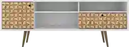 The Vallar Mid-Century Modern console presents a mid-century modern at its best. Quality craftsmanship and careful detailing create the ultimate blend of style, functionality, and brilliant design. A sophisticated entertainment center, the piece features open shelving, as well as two hidden compartments perfect for stashing DVDs, board games, electronics, and media accessories. Free standing and easily moved, this stand will mix well with any decor and its artful grooves will create a statement in any space. The Vallar comes in white finish with light brown doors. Customer assembly is required.