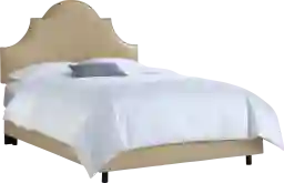 The bed features a sleek, contemporary design highlighted by an arched headboard and a sophisticated sandstone finish. A decorative row of nailhead trim along the headboard adds a tailored, high-end feel, while the tapered legs provide a clean, modern silhouette. The headboard is also constructed with plush foam padding, offering a comfortable surface for sitting up to read or watch television.