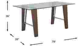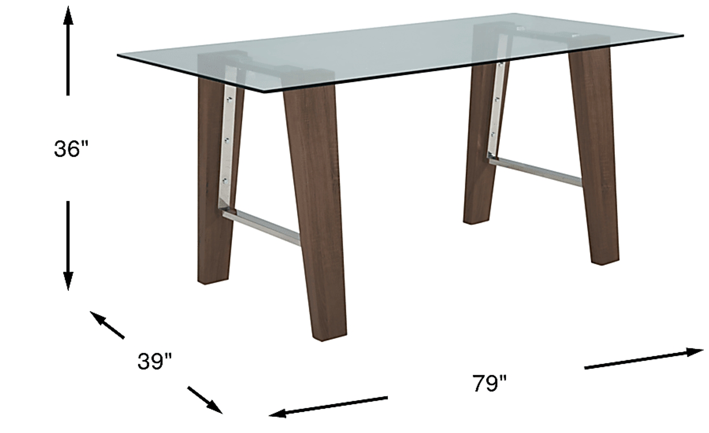 Style is always on the menu with the Valmont dining table. This modern contemporary table features a 39 x 70-inch clear glass top supported by tapered legs with a wood grain effect in a brown finish. Chrome stretchers add sleek support.