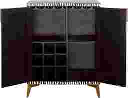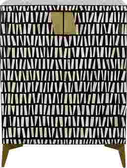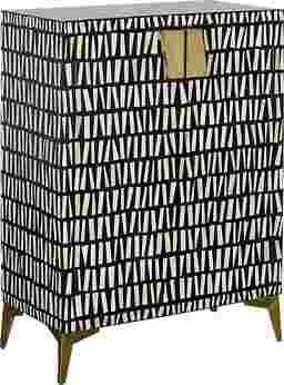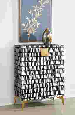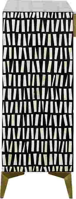 This Valona two door cabinet brings contemporary charm with a bold pattern for a lively addition to your home. The frame has been constructed from sturdy mango wood with a carefully crafted bone inlay and contrasting black resin for a stunning appearance. Shiny gold painted iron door pulls and angled feet add additional glam to this stunning piece. The interior features a roomy compartment with a removable shelf making it the perfect storage option. Customer assembly is required.