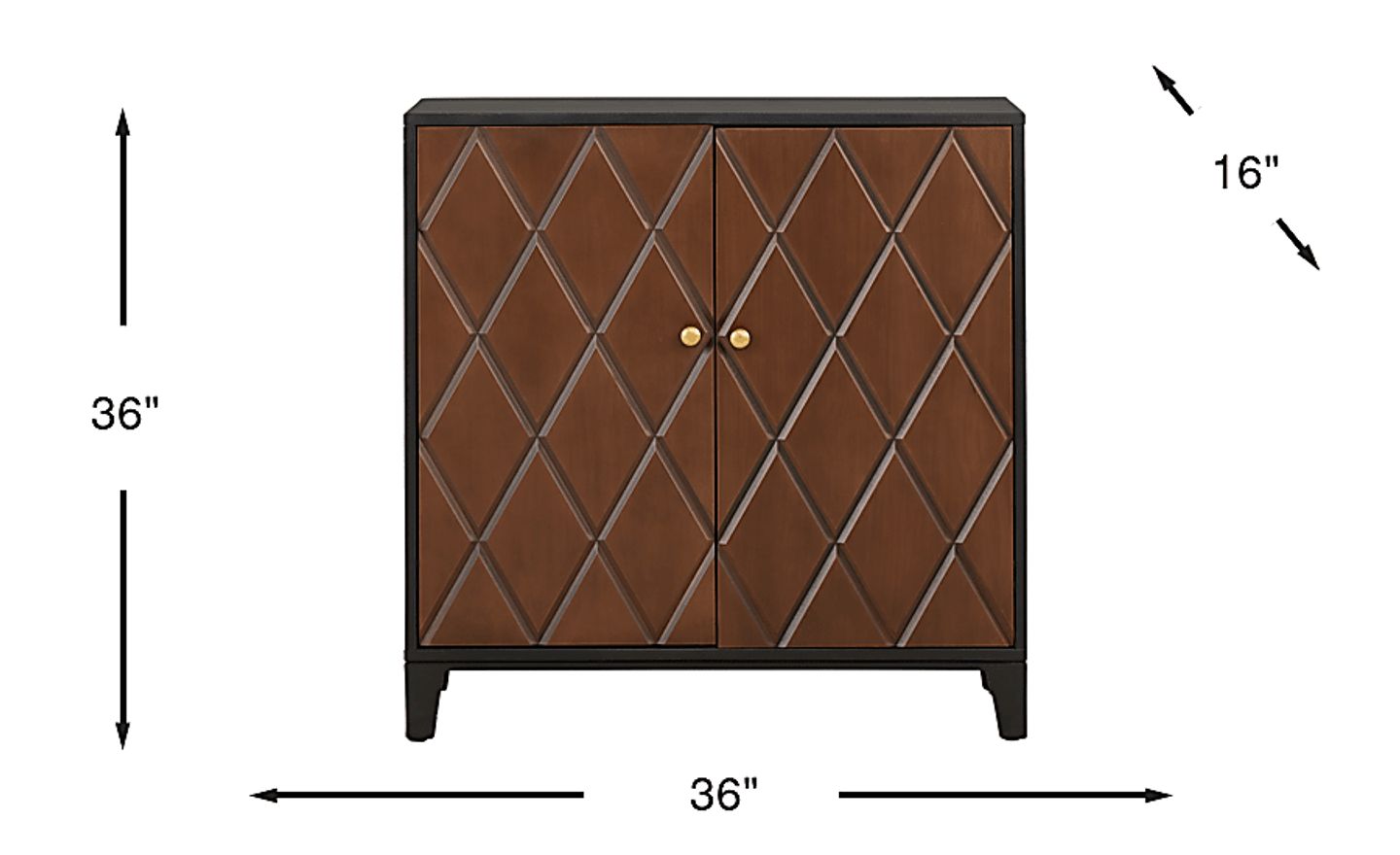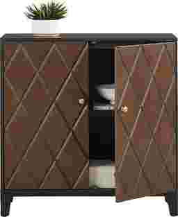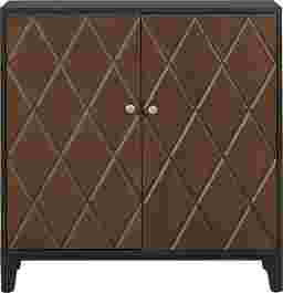 When the day finds its way back home, the Vance cabinet takes its place like the finishing note of a favorite tune. In the black lacquered frame of this accent, two doors rendered in a rich brown finish and cris-crossed with diamond patterns open onto shelves ideal for media storage, books and keepsakes.