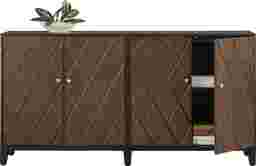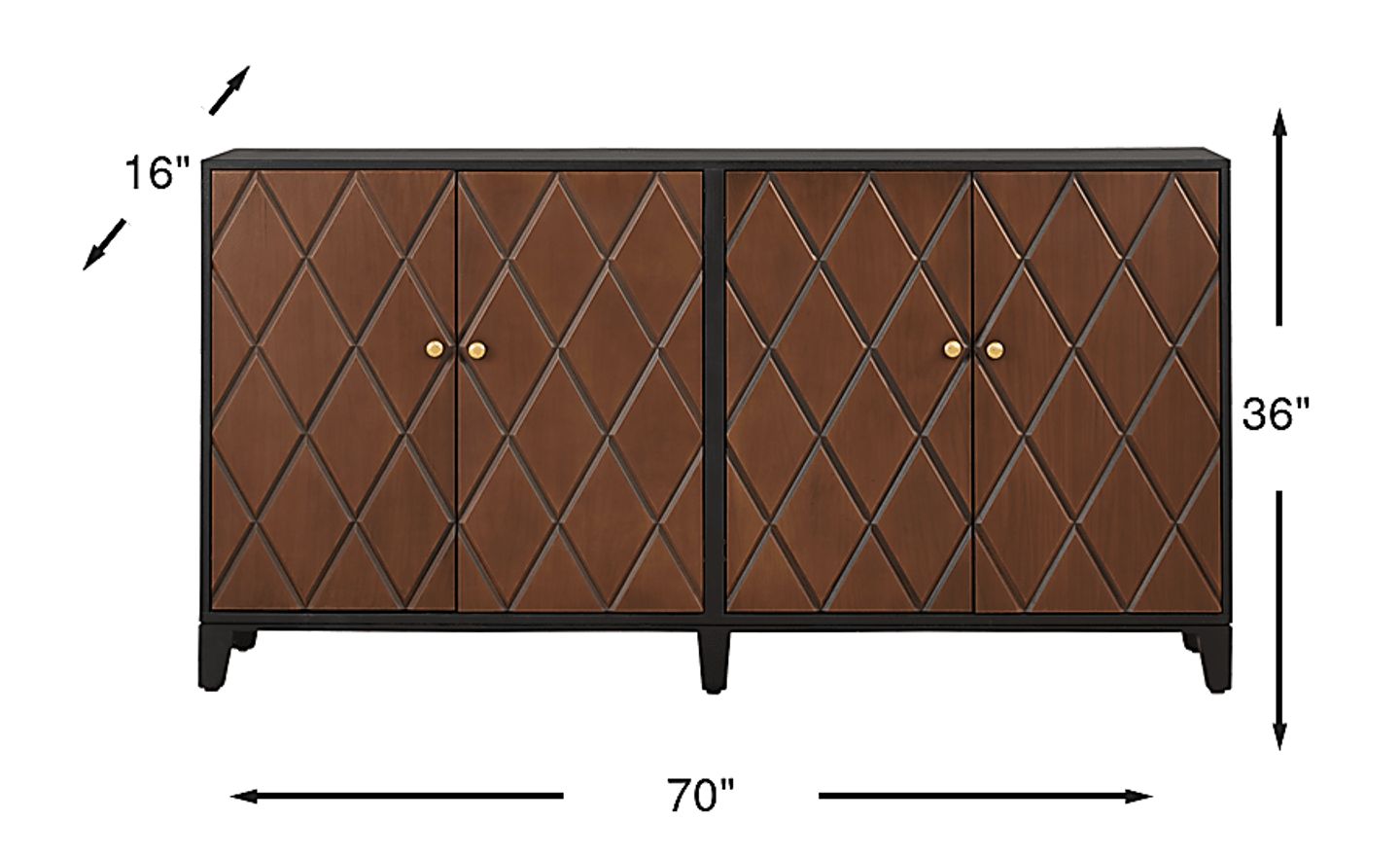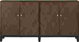 When the day finds its way back home, the Vance cabinet takes its place like the finishing note of a favorite tune. In the black lacquered frame of this accent, four doors rendered in a rich brown finish and cris-crossed with diamond patterns open onto shelves ideal for media storage, books and keepsakes.