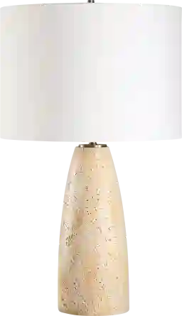 The Vanderbilt Bay Beige Lamp blends natural charm with timeless sophistication. The crafted base exudes an earthy essence that features an unfilled travertine look while plated antique brass detailing adds a refined touch. The round hardback drum shade is finished in a crisp white linen fabric. Partial assembly may be required.